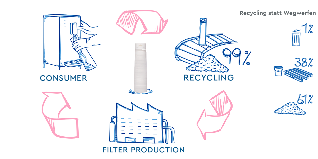 Ein weiterer wichtiger Aspekt für unsere Prozessoptimierung sind unsere internen Kreisläufe bzw. das Schließen eines solchen Kreislaufes. Zur Zeit können wir lediglich das Harz der Filterkartuschen wiederverwenden. Ziel ist aber mehr wieder in unseren Produkten einzusetzen. Aufgrund der regulatorischen Grenzen ist eine Trinkwasserzulassung für recyceltes Polypropylen, den Kunststoff den wir für unsere Filterkerzen verwenden, noch nicht möglich.