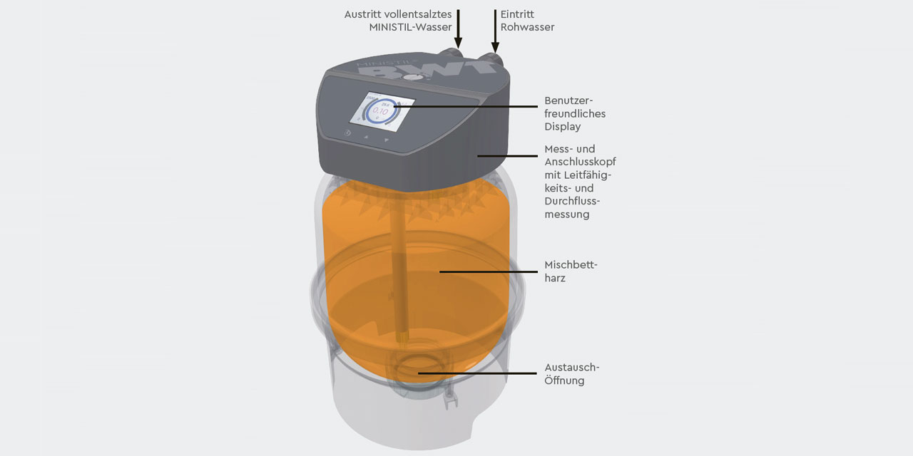 Dank der hochmodernen und hygienischen Regenerier- und Abfüllstation können wir unseren Kunden für alle MINISTIL Patronen einen eigenen Regenerierservice anbieten. Alle IonenaustauschPatronen arbeiten mit Harzen, die nicht durch ihre Betreiber am Einsatzort, sondern in einer zentralen Regenerierstation zusammen mit den Harzen mehrerer Kunden regeneriert werden. Diese Stationen erfüllen die ökonomischen und ökologischen Anforderungen an eine optimale Harzregeneration. Dank der hochentwickelten Regenerationstechnik und der nahtlosen Qualitätskontrolle unserer regenerierten Ionenaustauschharze erzeugen unsere Patronen aus jedem Trinkwasser dieselbe hohe Wasserqualität.