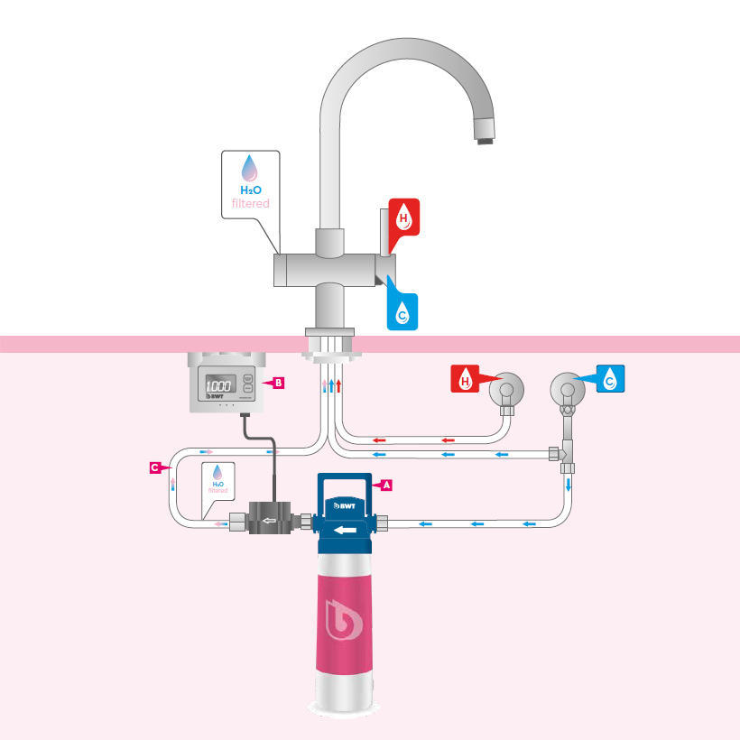 Der Klassiker unter den Wasserfiltern in der Küche ist ein sogenannter Einbau-Wasserfilter. Der Filter und - je nach Geräteausführung - die Kühleinheit, der Boiler sowie die CO2-Flasche werden unterhalb der Spüle eingebaut und sind somit nicht sichtbar. Der Wasserhahn wird durch eine BWT Armatur mit integrierter doppelter Leitungsführung getauscht. Alle BWT Armaturen mit Filter lassen sich einfach installieren.