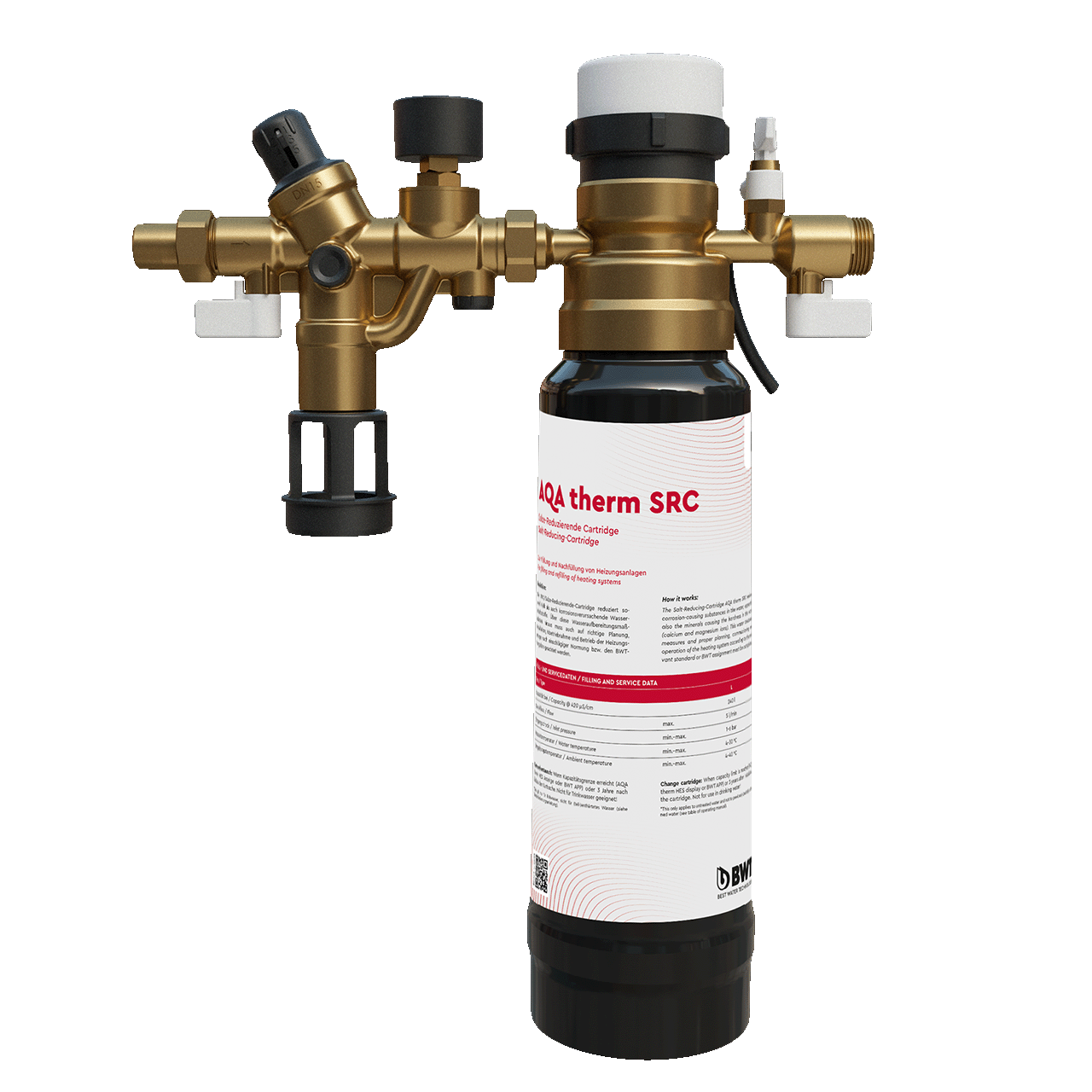 Die AQA therm HWG besteht aus den Komponenten AQA therm HFB Eco (Heizungsfüllblock), AQA therm HES Eco (Heizungsstation) und der Einwegkartusche AQA therm SRC (Salze-Reduzierende-Cartridge), Größe M.