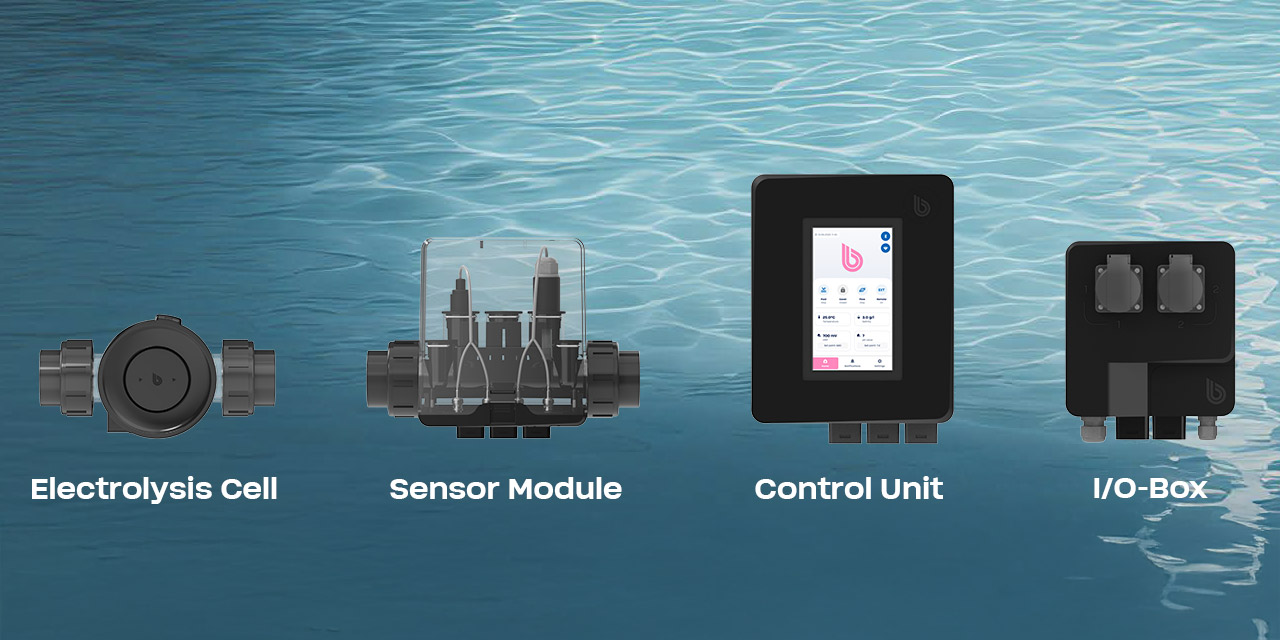 The system can be used only as a salt electrolysis system or expanded into a fully-featured pool control system by adding further components from our modular system. Expandable with I/O-Box, larger cell cores and dosing pumps.