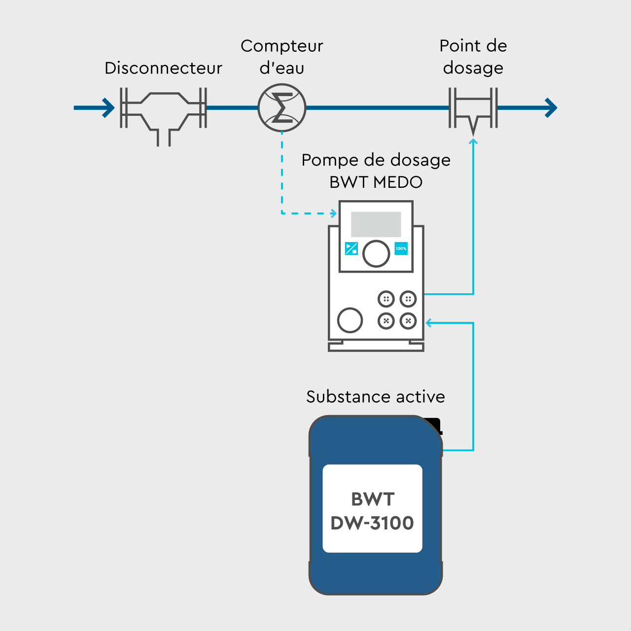 Mode de fonctionnement : Désinfectant très efficace pour lutter durablement contre les légionelles, les germes, les champignons, les algues et les virus. L'utilisation se fait par activation de deux composants, ce qui n'est nécessaire que juste avant l'application. Après l'activation, on obtient une solution de dioxyde de chlore à 0,3% pour la désinfection. Grâce au procédé spécial et à la grande stabilité de la solution activée, il n'est pas nécessaire d'investir dans une vaste technique d'installation.