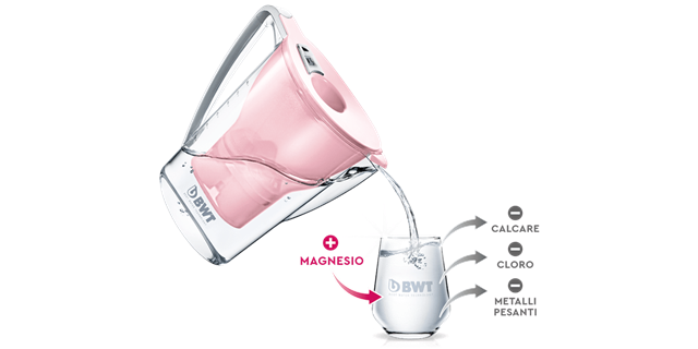 Nell'esempio dell'acqua mineralizzata al magnesio, il granulato per filtro BWT è provvisto addizionalmente della tecnologia del magnesio brevettata che rilascia nell'acqua filtrata ioni di magnesio in sostituzione agli ioni di calcio. In tal modo la riduzione del valore pH è molto inferiore rispetto ai tradizionali filtri per acqua potabile. Come risultato, l'acqua avrà un sapore migliore, come anche le pietanze e bevande preparate con essa.